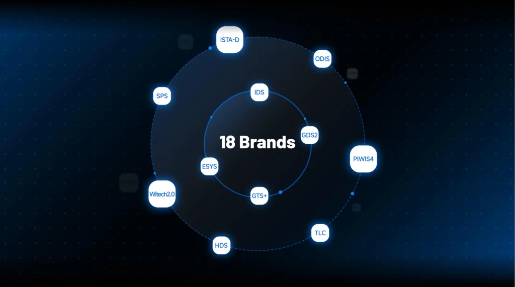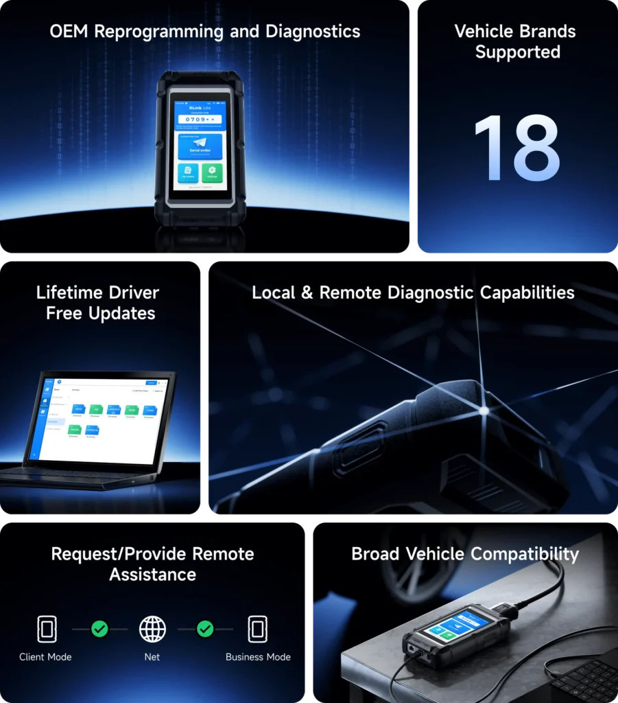 Unleash dealership-level power with RLink Lite. It integrates effortlessly with OE diagnostic software of 18 vehicle brands, providing advanced functions such as ECU programming, coding, service resets, and active tests. Consolidate your tools, reduce expenses, and grow your diagnostic service offerings with this all-in-one diagnostic tool.